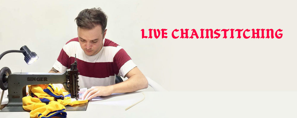 Custom chain stitch embroidy is available in-store only. At the moment we are only offering monogramming - Single line chainstitch script of 1-2 words on patches/bandanas/hats or direct to your garment.