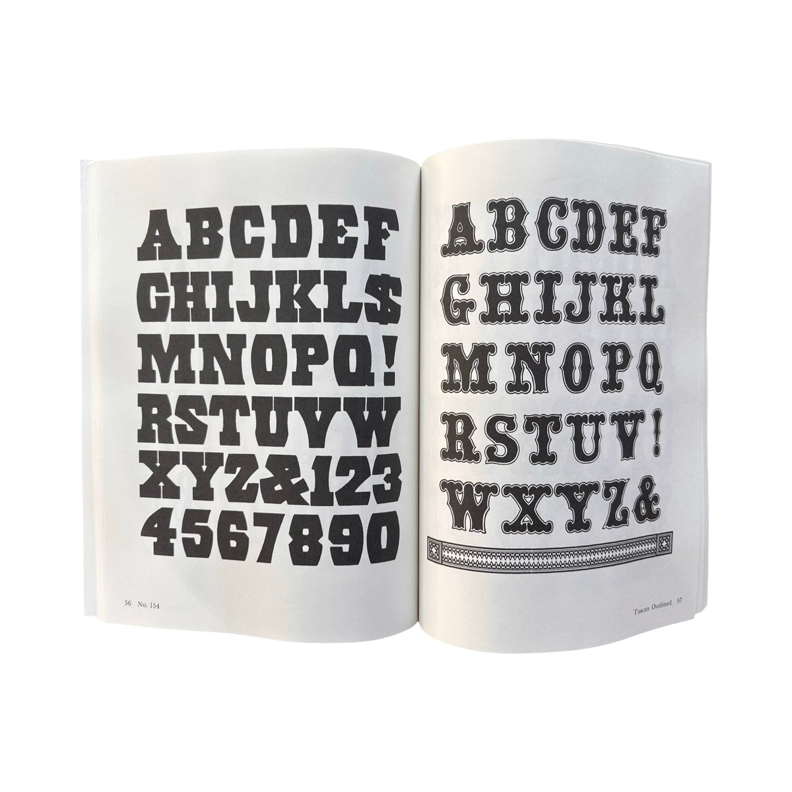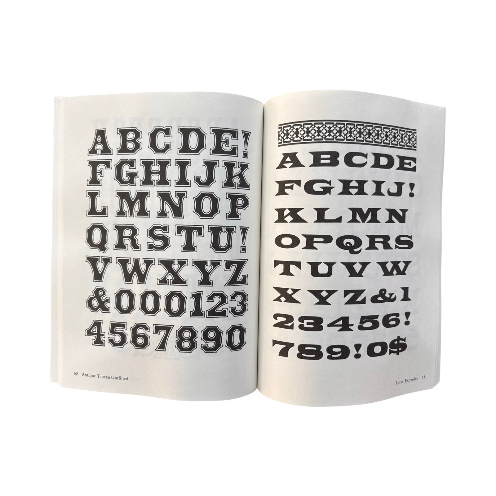 Beautiful selection of 100 19th-century American wood type fonts, many reproduced at actual size. Each font features a complete alphabet of capitals; many include lowercase letters, numerals, and punctuation marks.