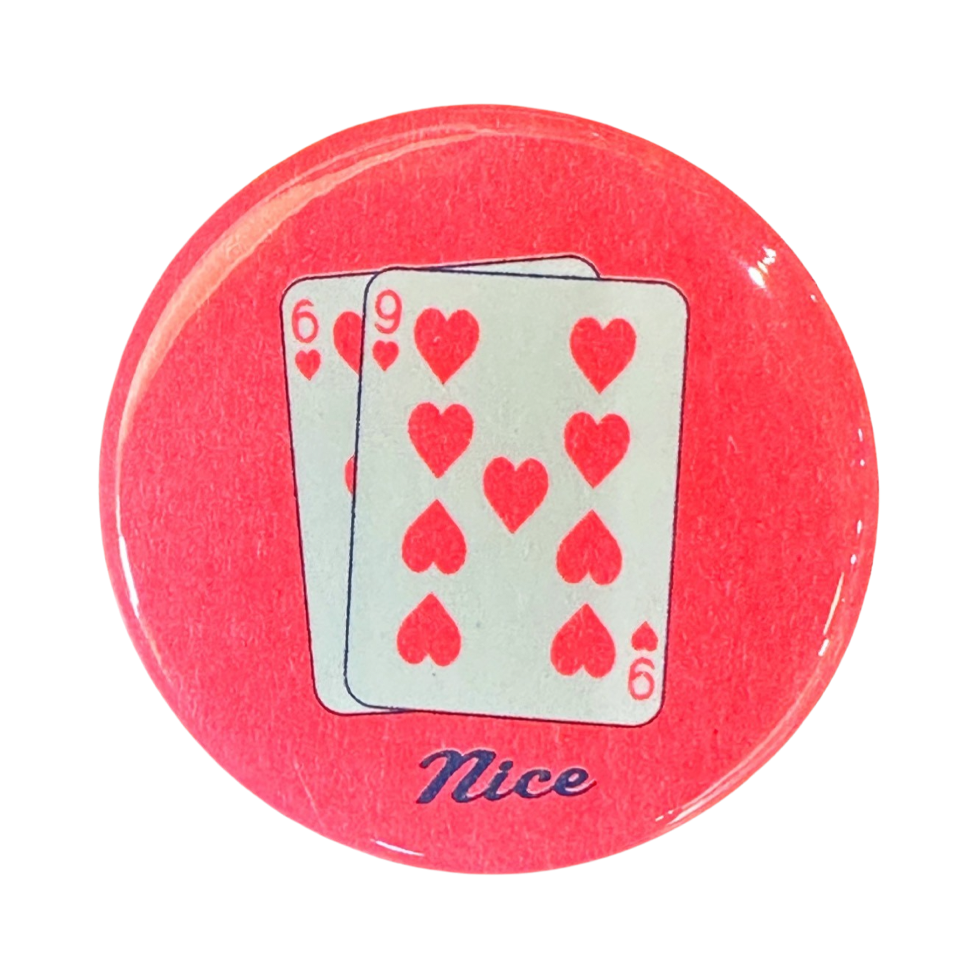 My favorite poker hand that I never win with is the "NICE!" also known as 6 9 Suited Hearts. I wanted it as a button so now you can get it too.