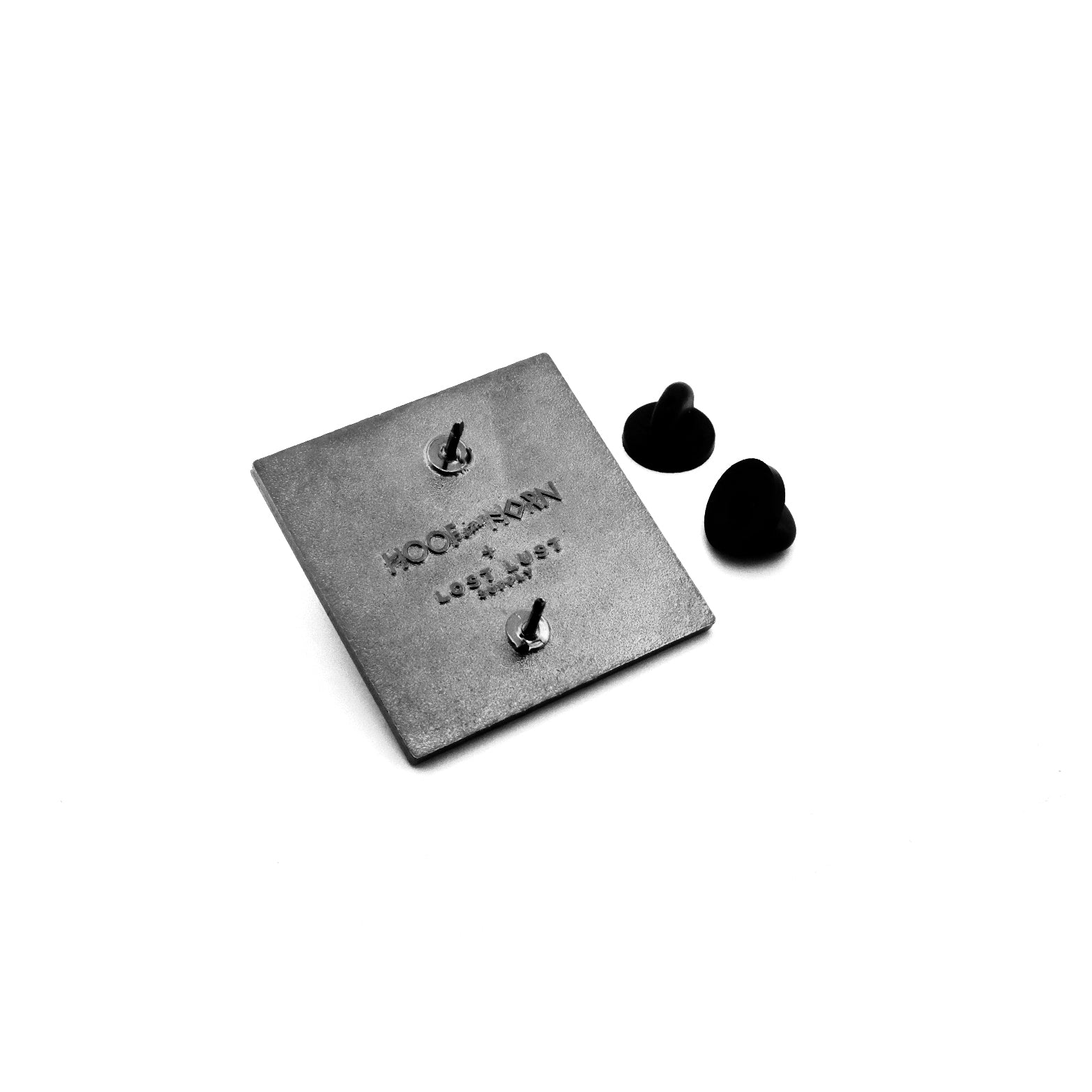 Hoof & the Horn + Lost Lust Supply. A 1.4" x 1.4" hard-enamel pin. Includes double black rubber clutch backers, mounted on a custom backing card with a photo by Brian Stowell. Designed by Charlie Wagers.