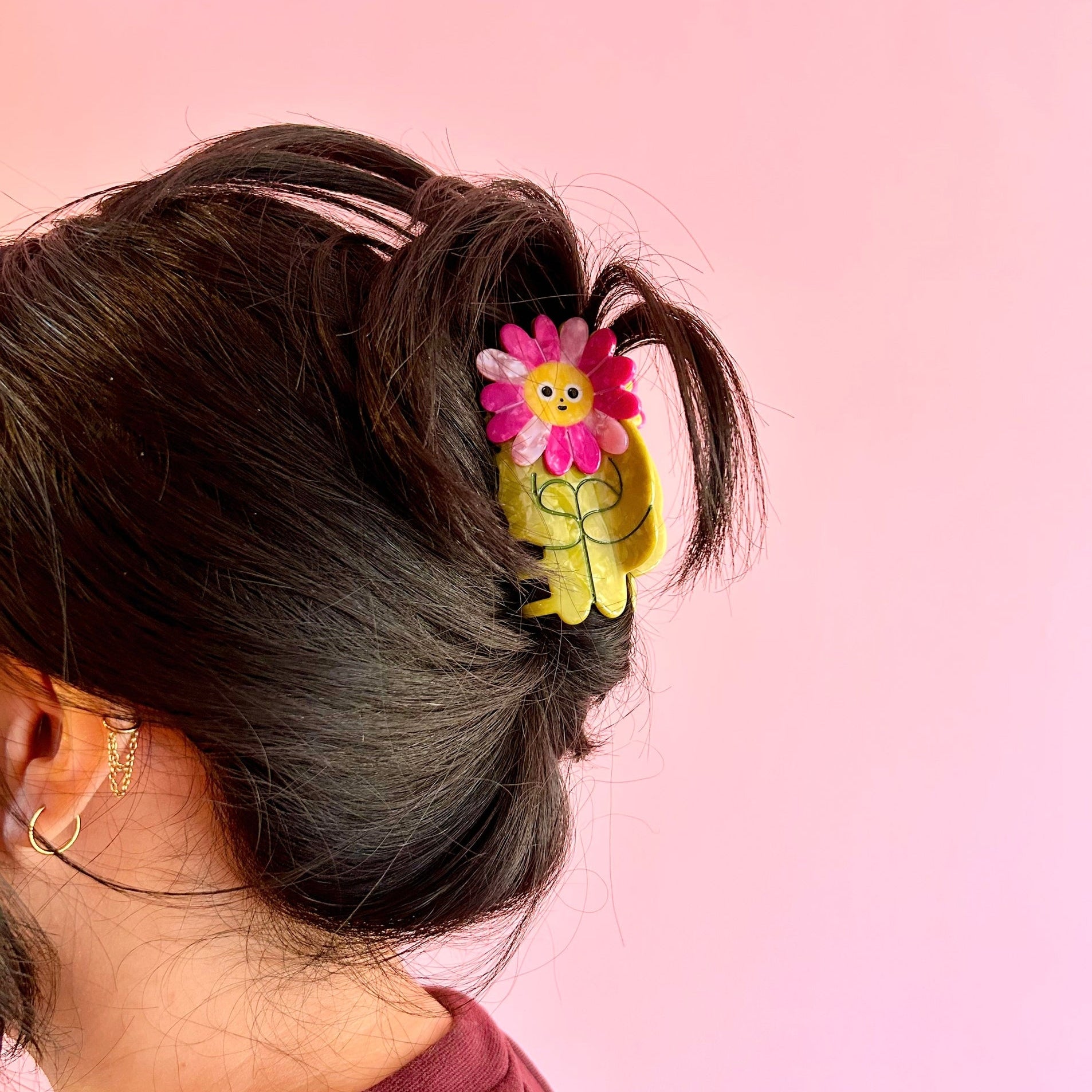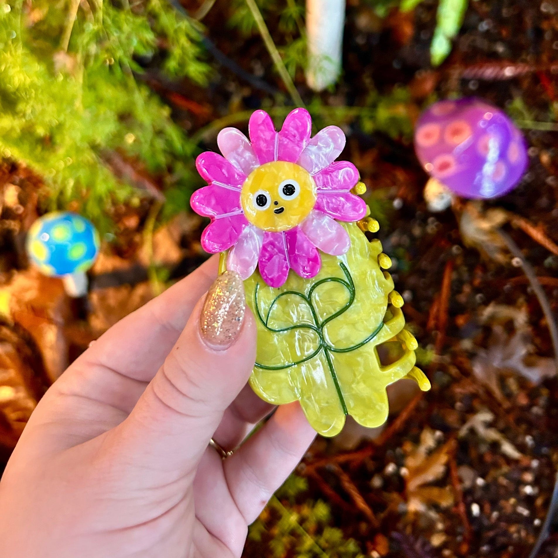 This lil flower guy was originally inspired by a sifaka (basically a lemur) I saw at the zoo, sitting all by himself holding his knees to his chest. Since then I've turned him into a pin, a lighter, and now a hair claw! Take him everywhere with you! Show him the world!