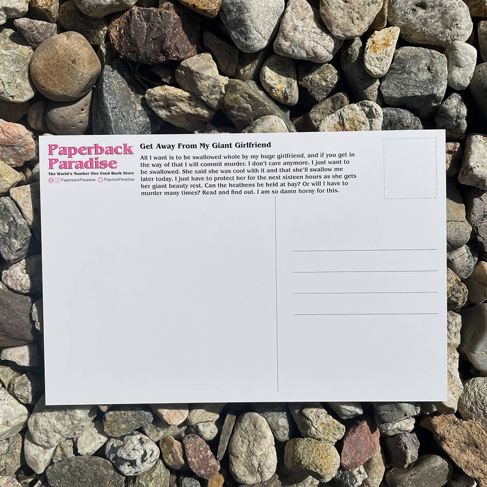 6 x 4 postcard printed on 14 pt cardstock, UV gloss coating on the front to ensure durability, matte finish on the back that features a brief synopsis of the book, space to write an address and message, along with Paperback Paradise branding. Designed and printed by Paperback Paradise.