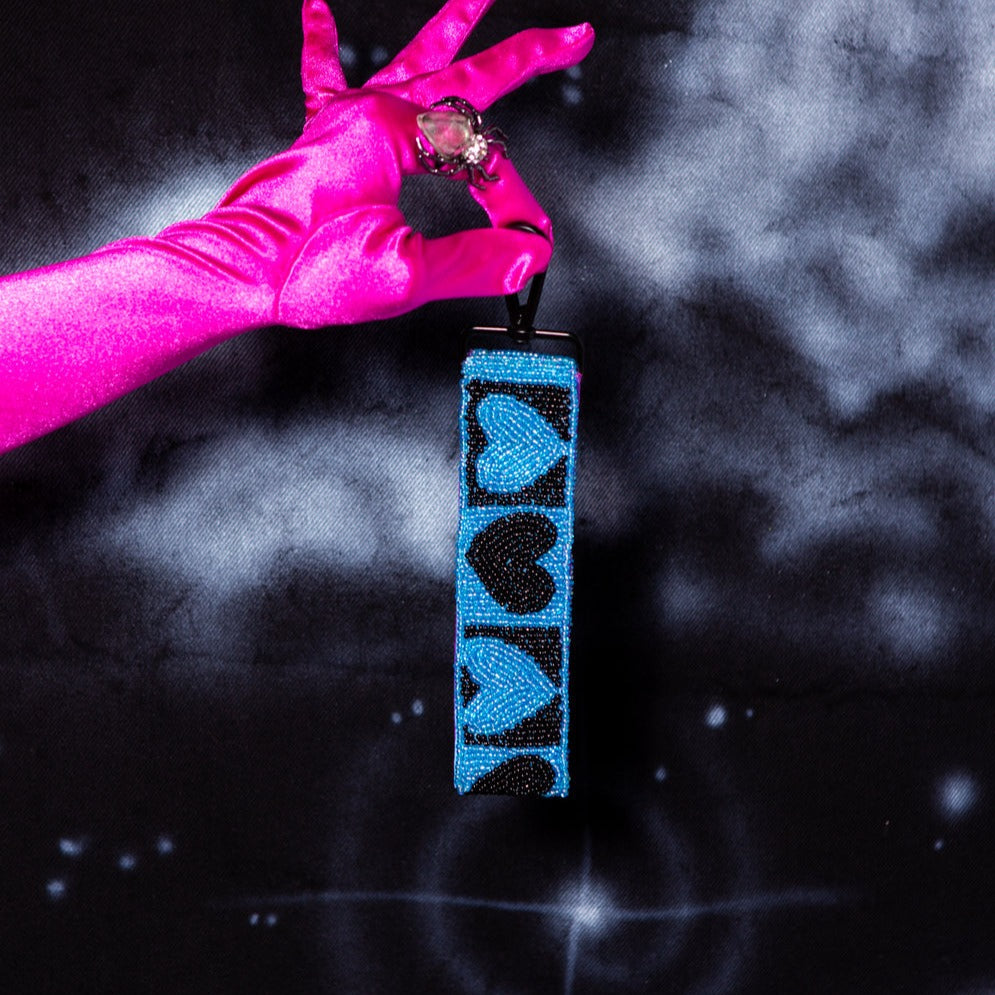 beaded purse with purple satin lining, black zipper closure, & beaded wrist strap