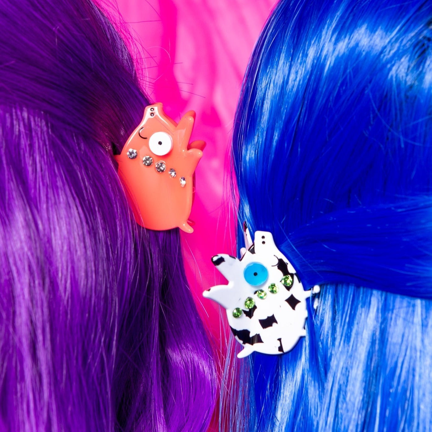 small acetate piggy claw clips with paint-filled engraving and rhinestone necklaces