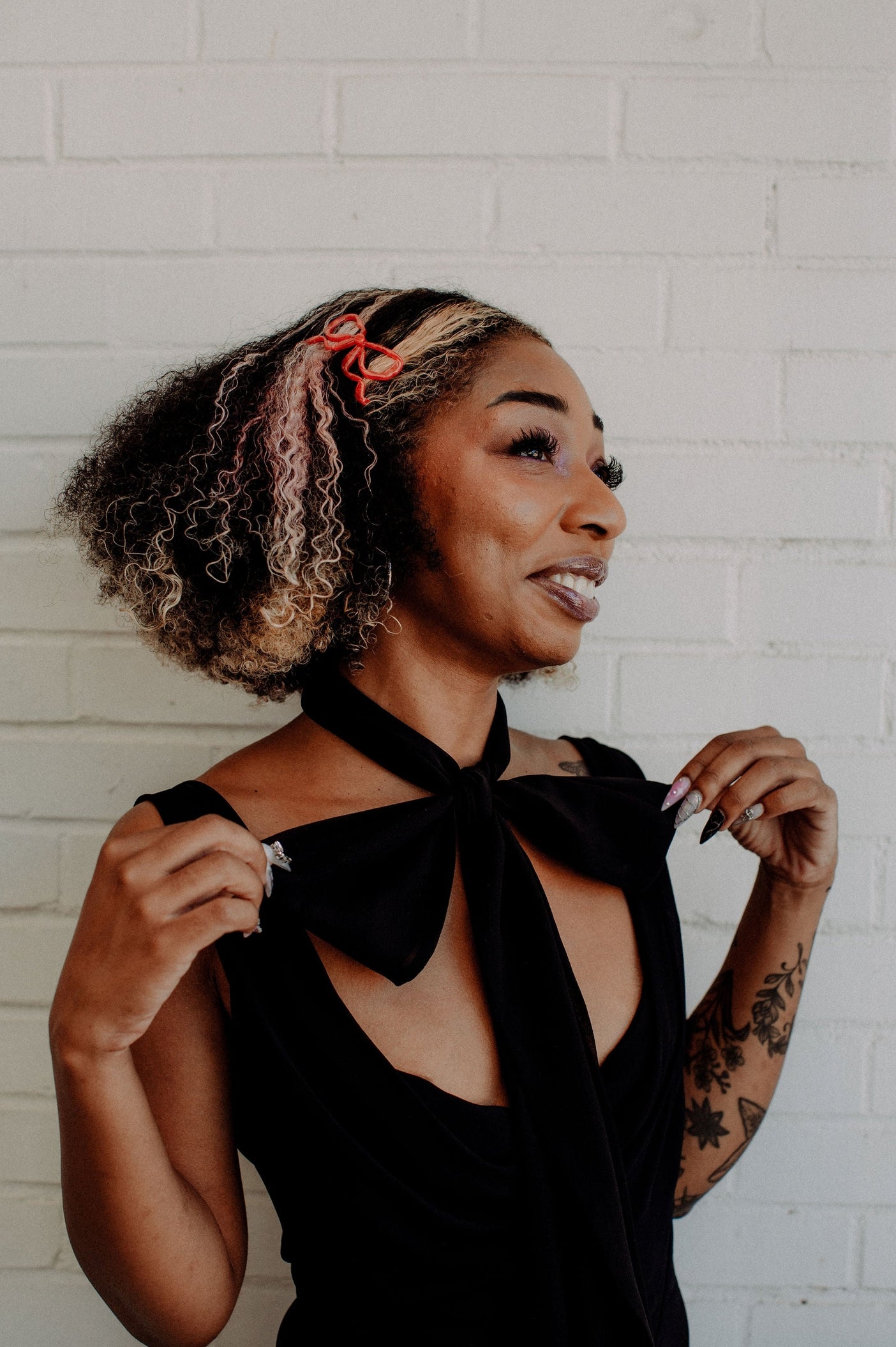 The quickest way to add a bow to any look. The Ribbon Bow Clip is a dainty bow made from swirling acetate, cut and engraved to look just like a sweet ribbon tied in your hair. Backed on a ball and clasp closure, the Ribbon Bow Clip can hold back your bangs or accessorize an updo. Available in three colors: baby pink, red, and black.