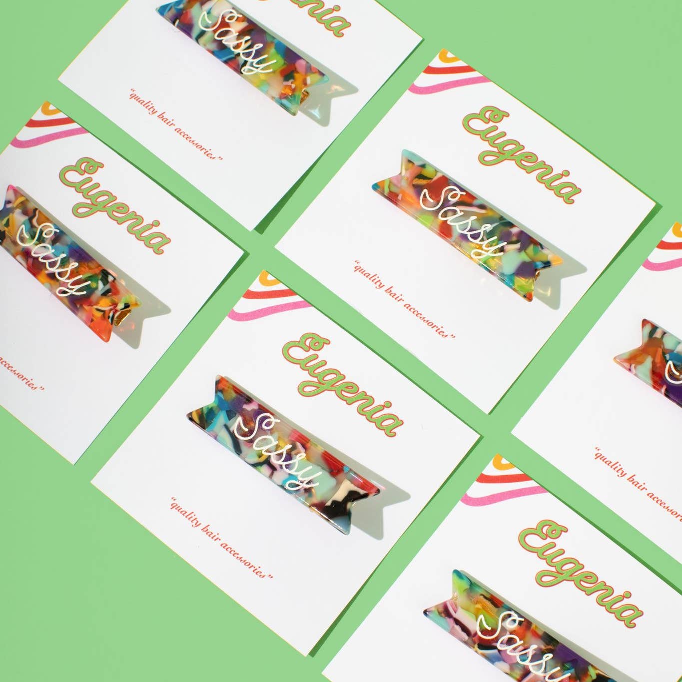 • 'Sassy' : Rainbow Confetti cellulose acetate with white cursive ink inlay and a gold alligator clip on the back.